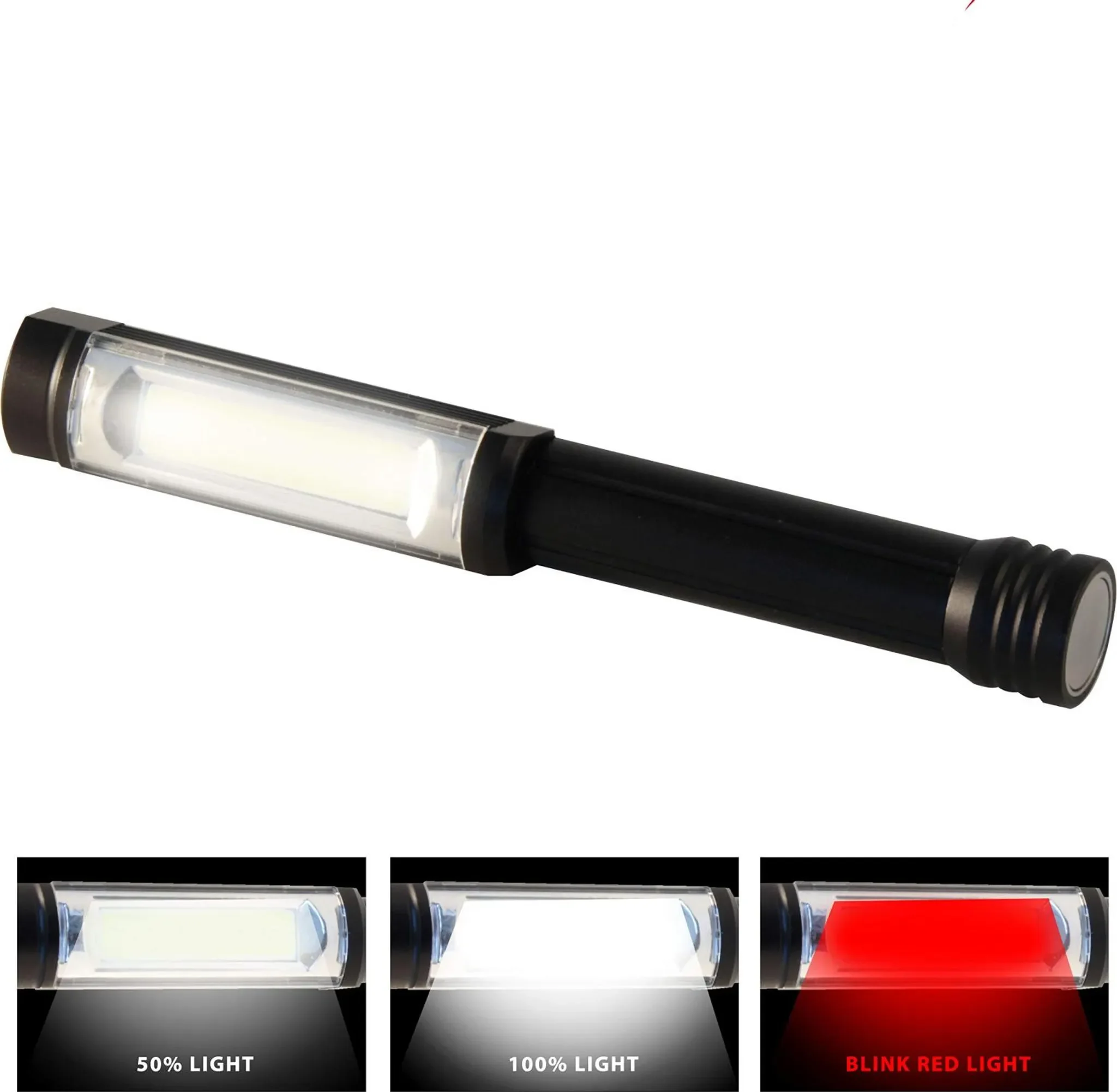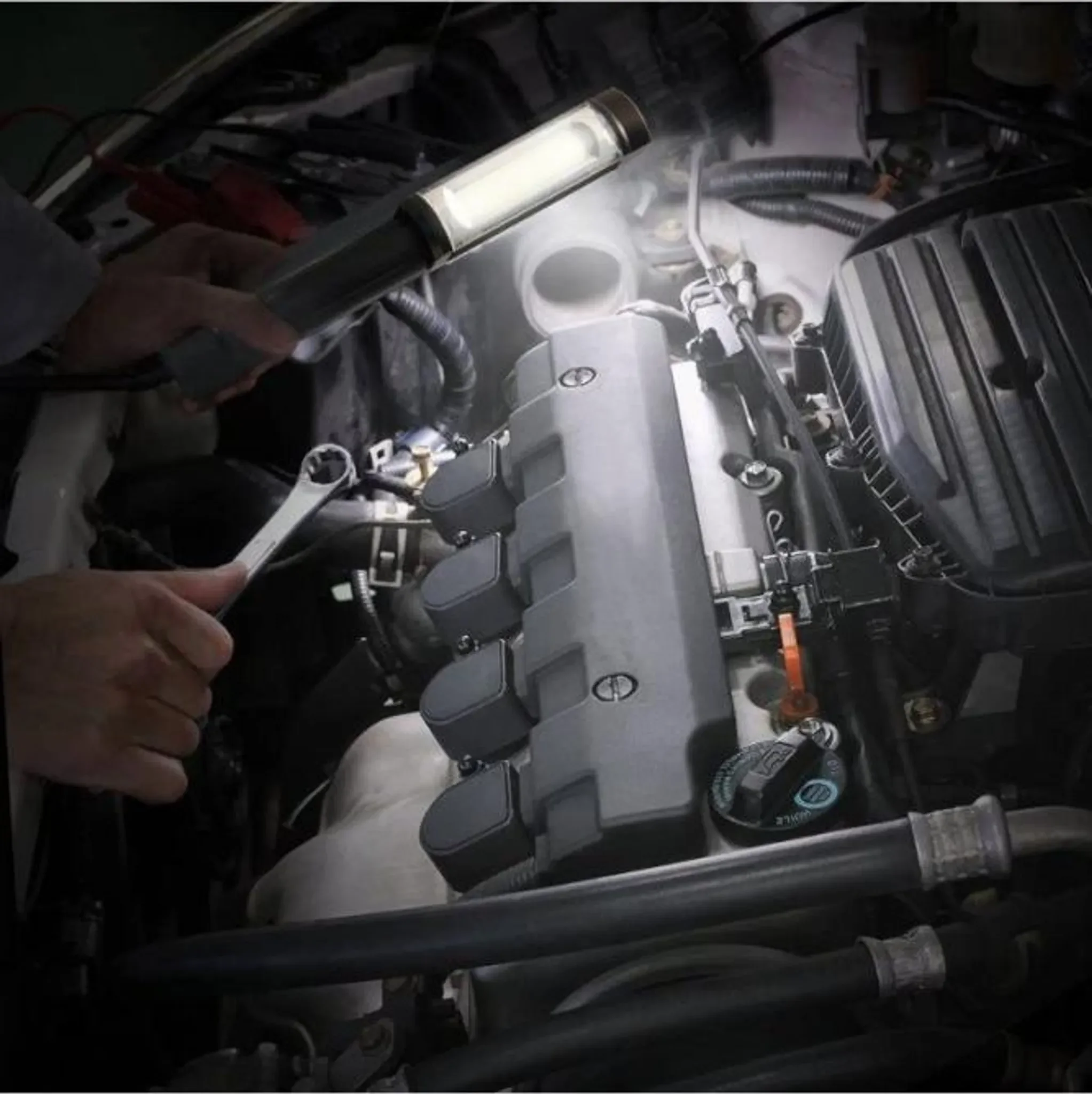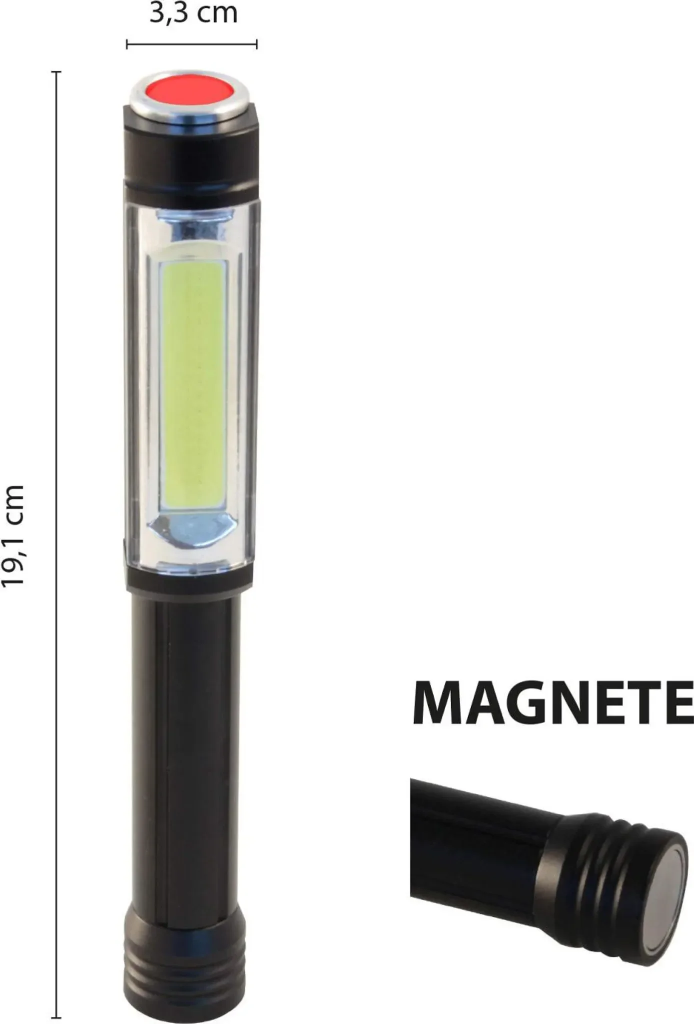 Highlights: Helles COB-Arbeitslicht, robustes Aluminiumgehäuse, integrierter Magnet und Haken, rotes Blinklicht für Notfälle, ideal für Werkstatt, Auto, Haushalt und Camping.