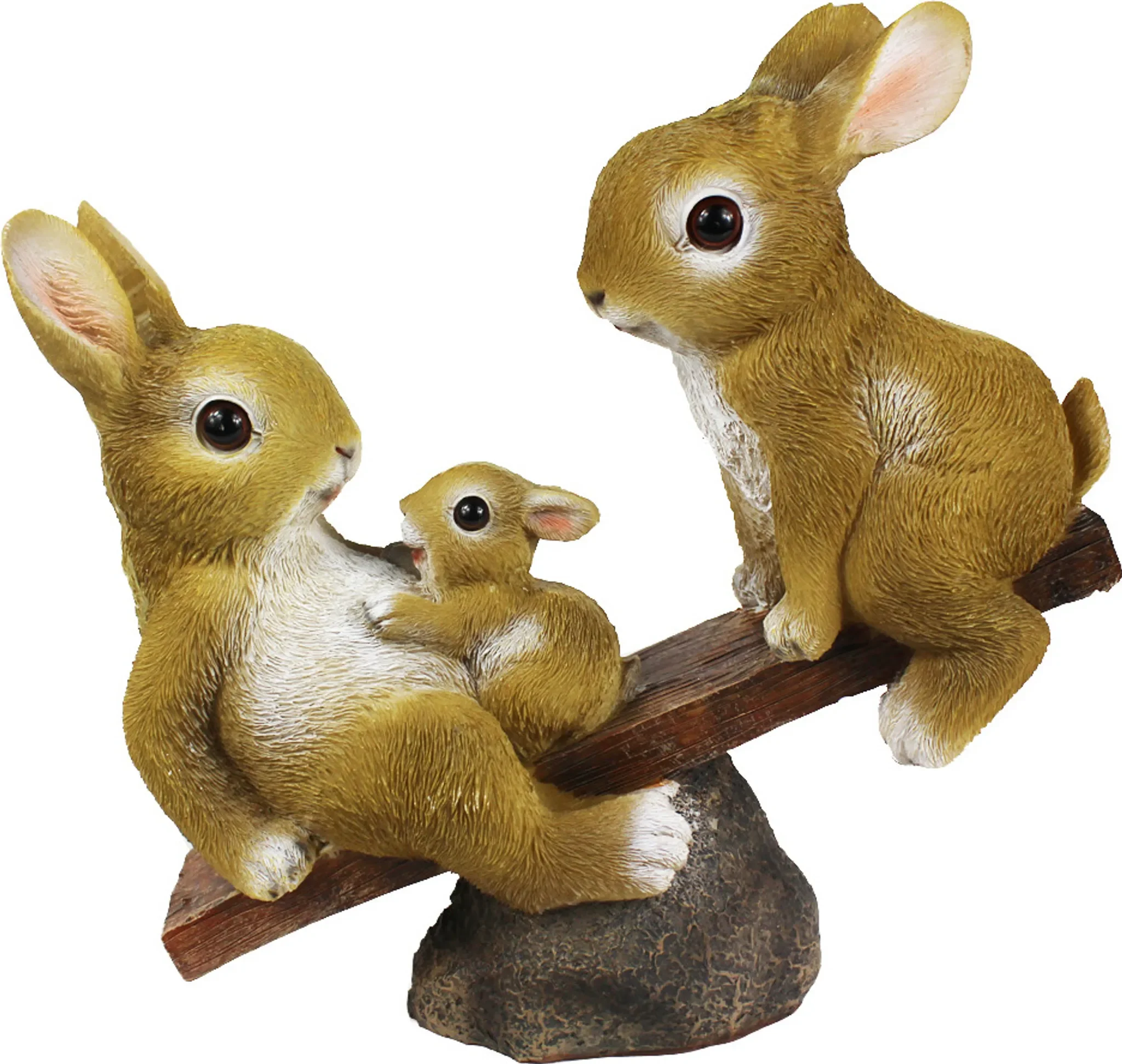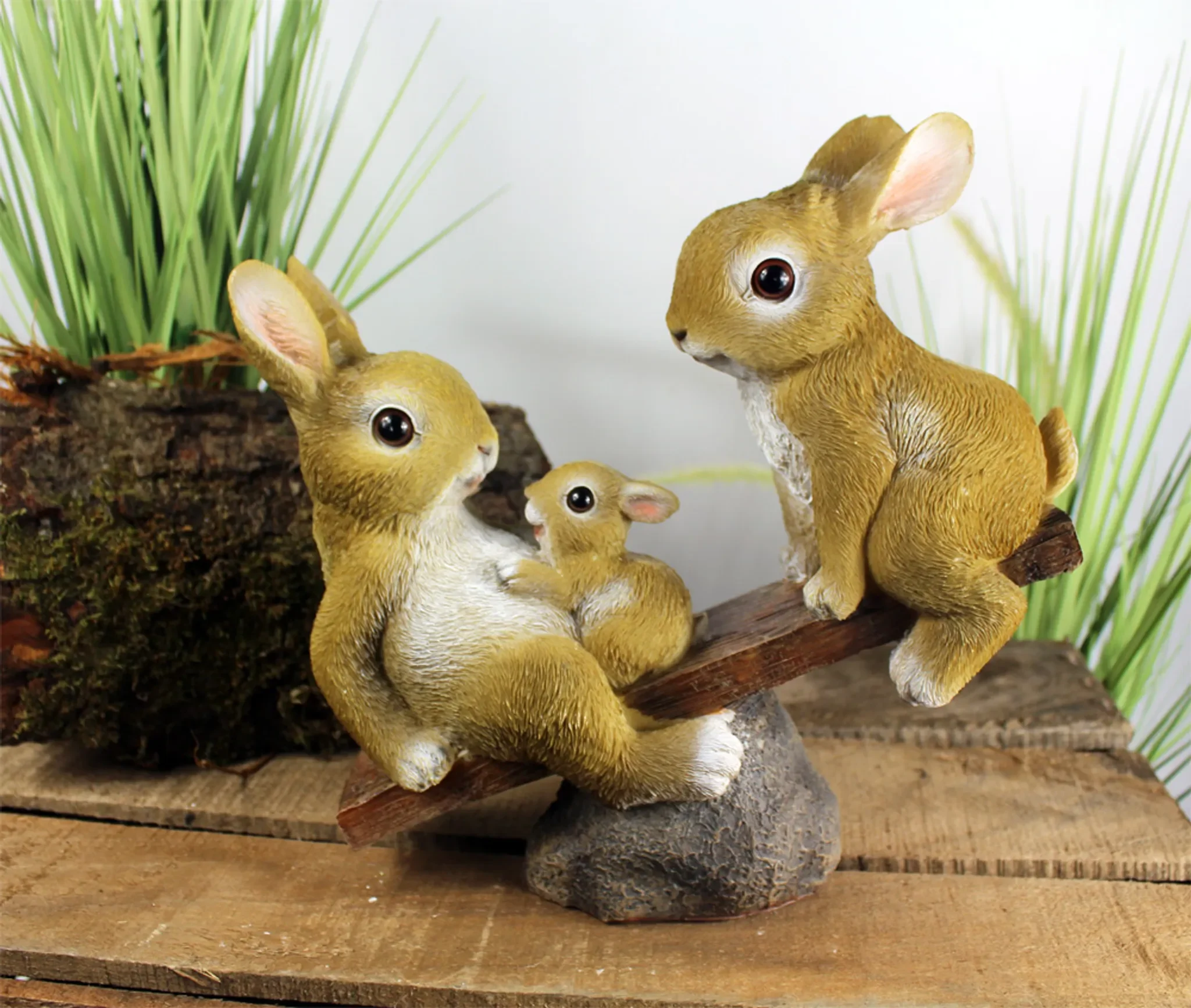 Dekofigur Hasenfamilie auf Wippe – Gartenfigur aus Polyresin