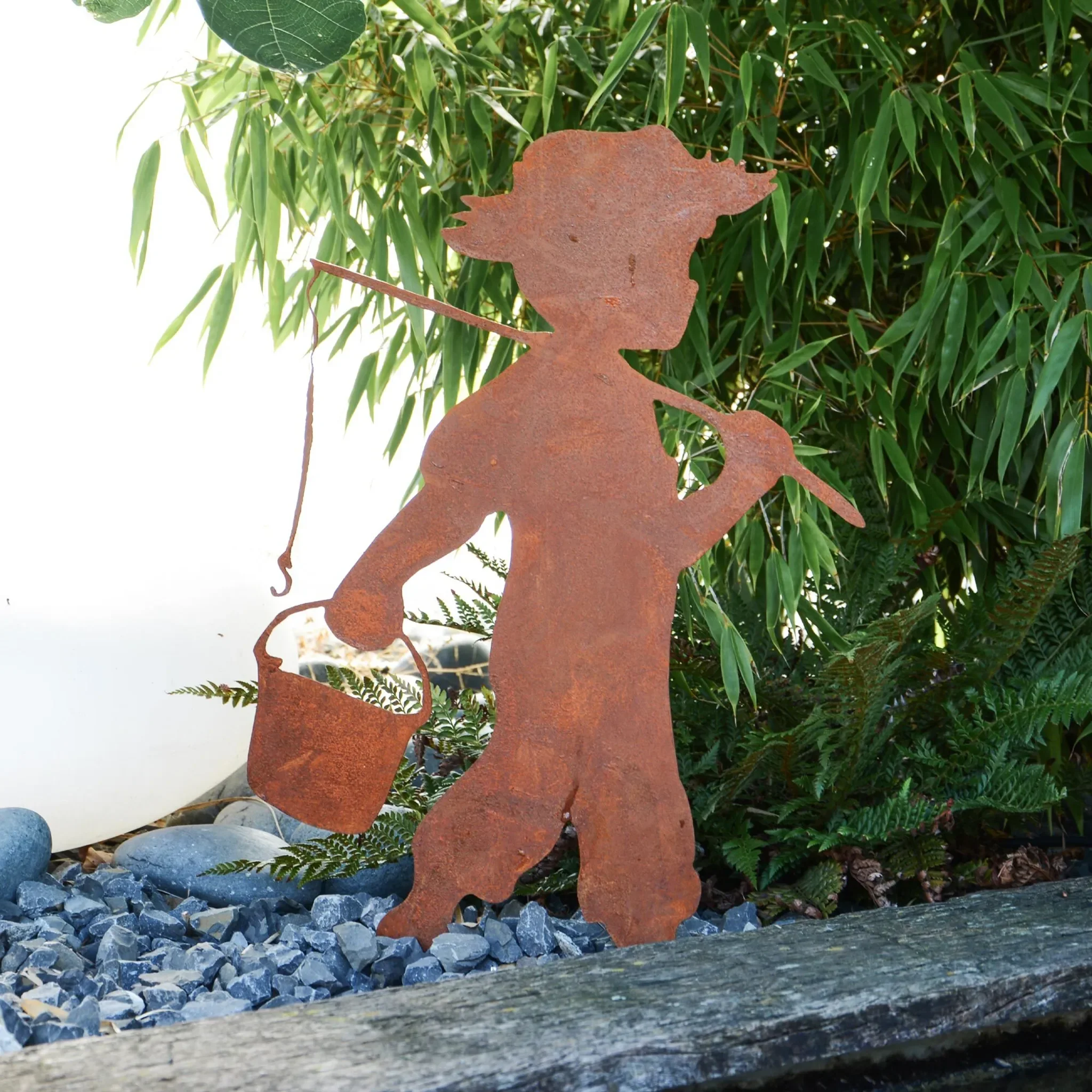 Gartenstecker „Kind mit Hut, Angel & Eimer“ – Edelrost Metall