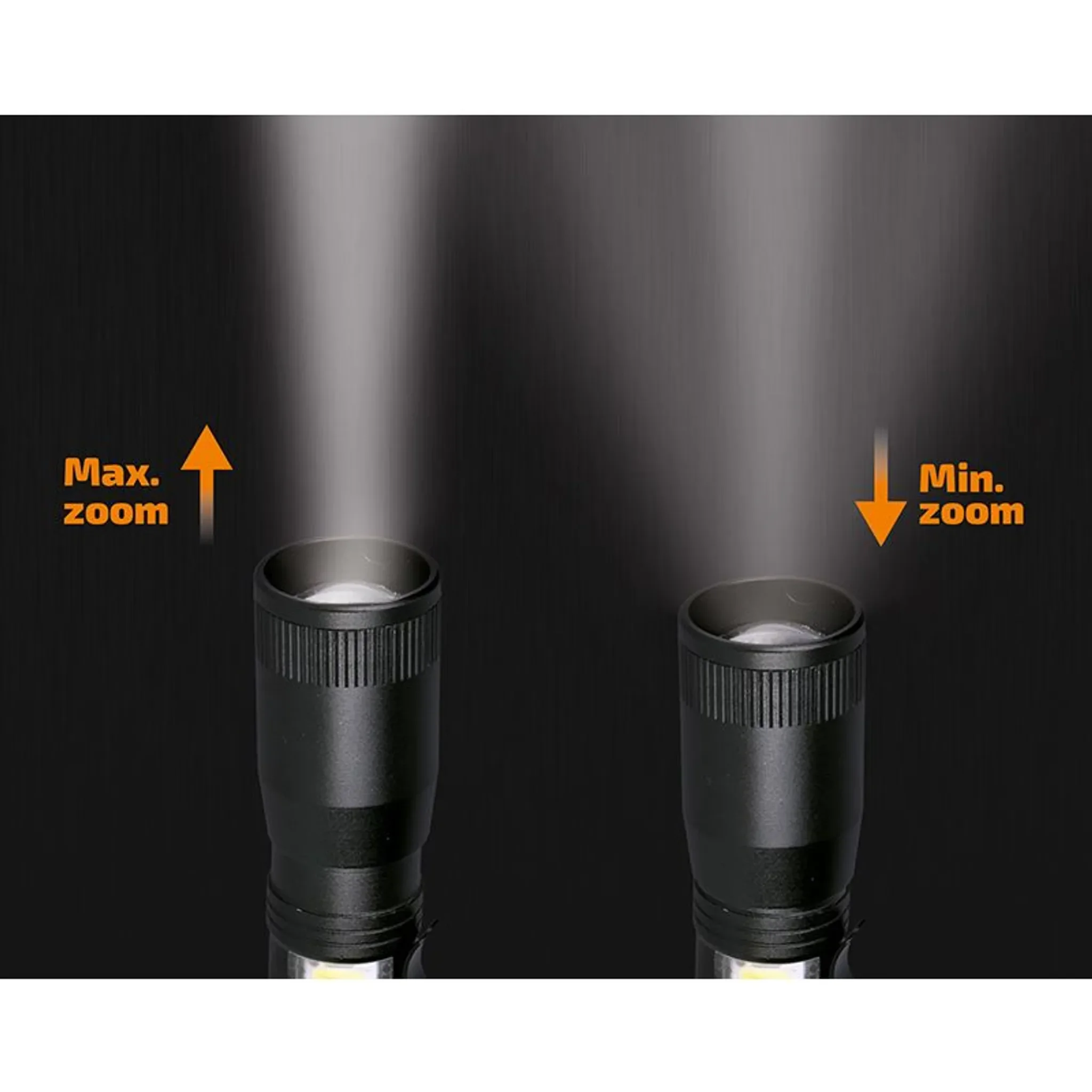 Dank Zoom- bzw. Fokusfunktion lässt sich der Lichtkegel flexibel anpassen. Mehrere Leuchtmodi ermöglichen eine situationsgerechte Ausleuchtung – von konzentriertem Spotlicht bis hin zur breiten COB-Flächenbeleuchtung.