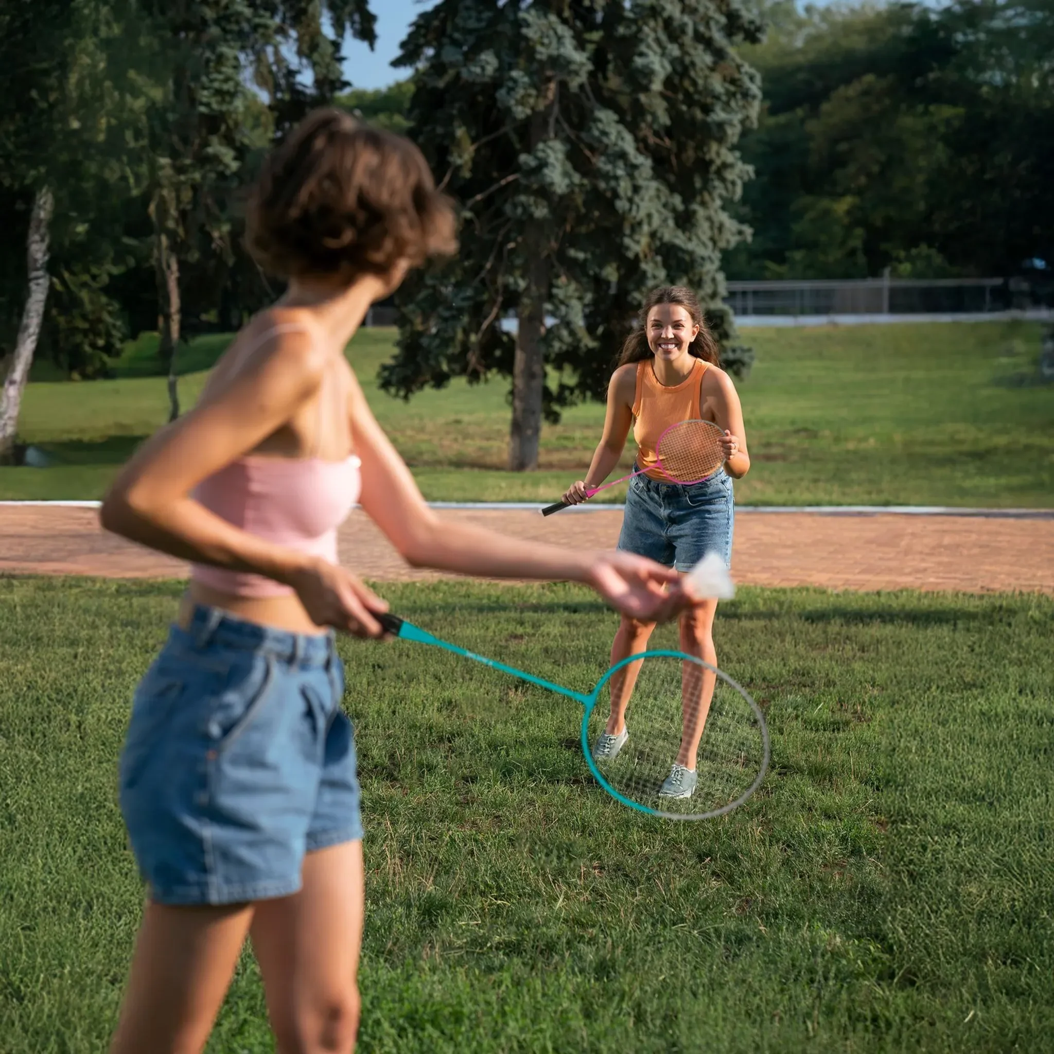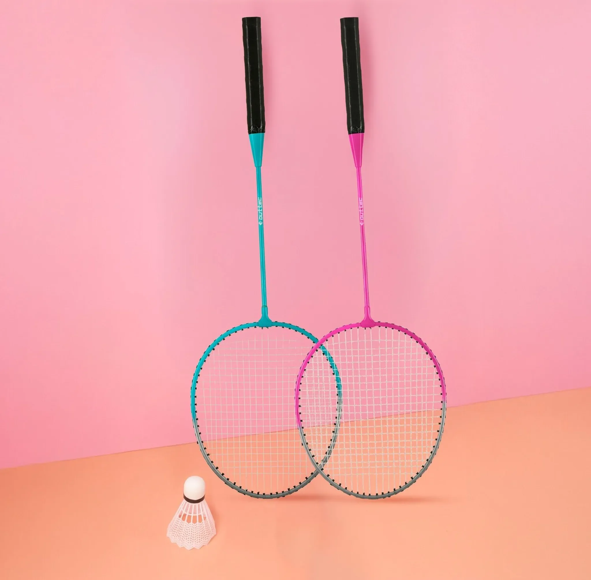 Die beiden Schläger bestehen aus einem robusten Stahlrahmen und -schaft, was sie besonders langlebig und widerstandsfähig macht. Dank des geraden Griffs liegen sie gut in der Hand und ermöglichen kontrollierte, präzise Schläge. Der mitgelieferte EVA-Federball mit Kunststoffspitze und synthetischen Federn sorgt für einen stabilen Flug und langen Spielspaß.