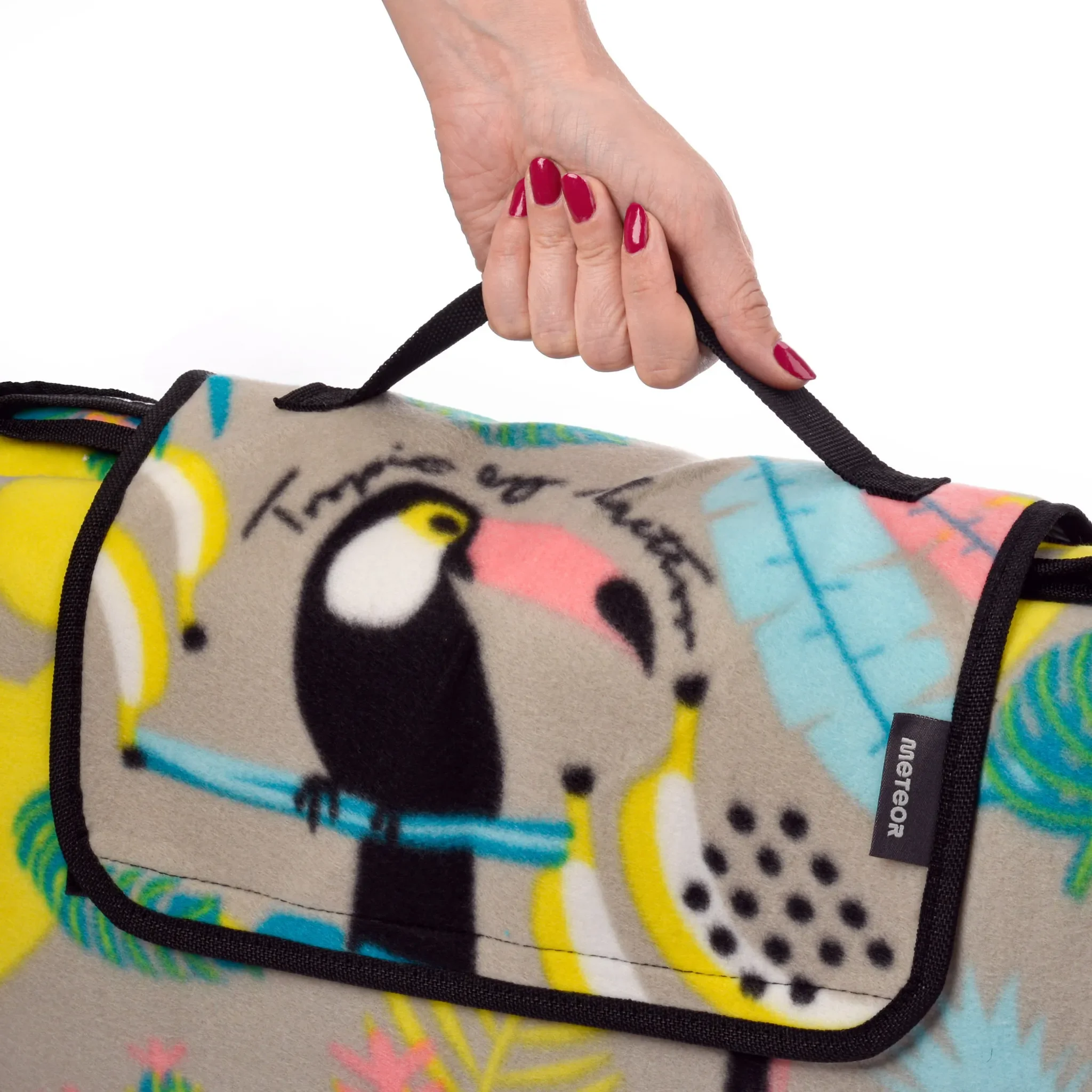 Durch die dreilagige Konstruktion bleibt die Decke auch auf feuchtem oder kühlem Untergrund trocken und warm. Nach dem Gebrauch lässt sie sich kompakt zusammenfalten, mit Klettverschluss fixieren und dank Tragegriff bequem transportieren. Das tropische Design macht sie zudem zu einem echten Hingucker.