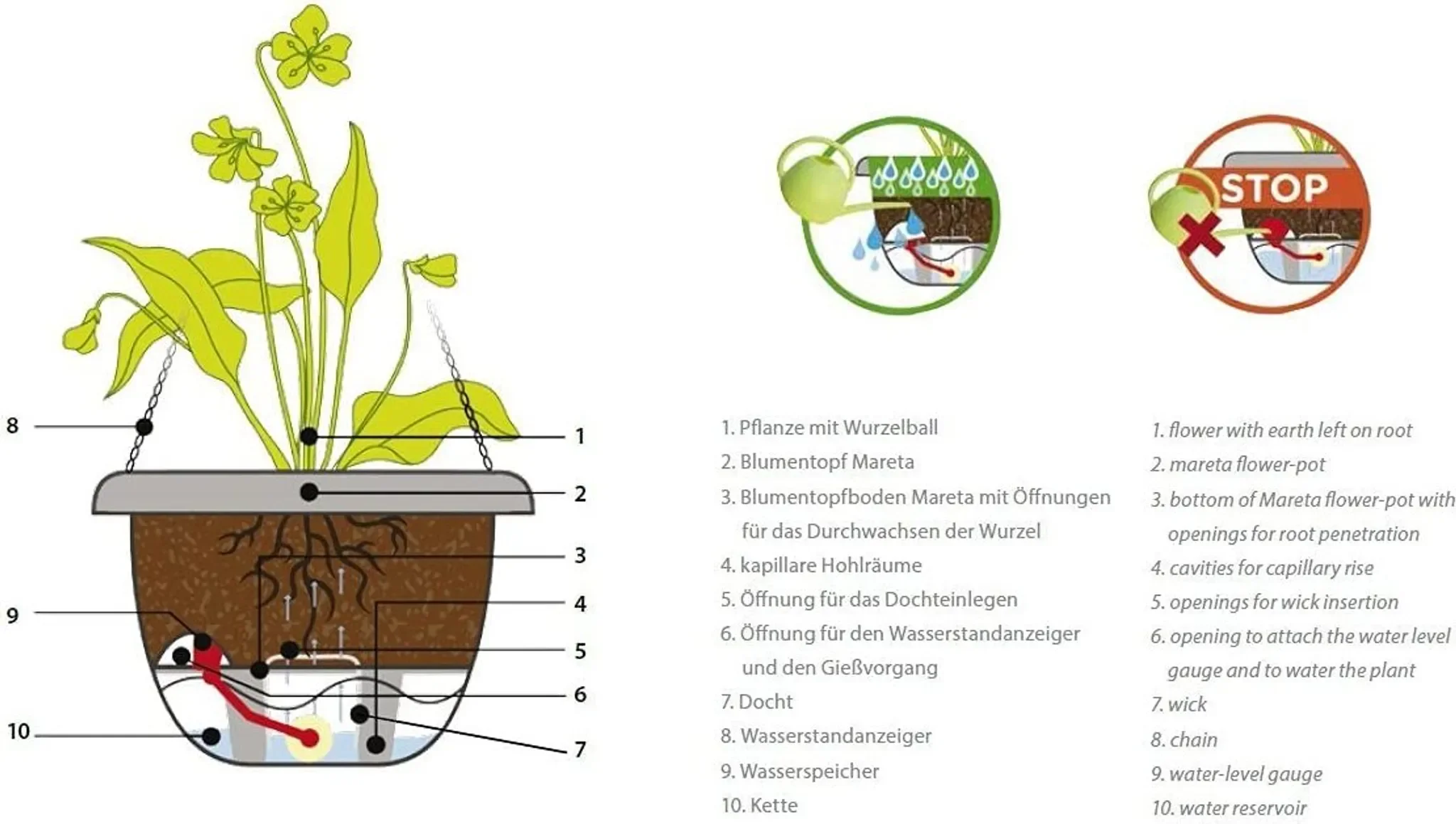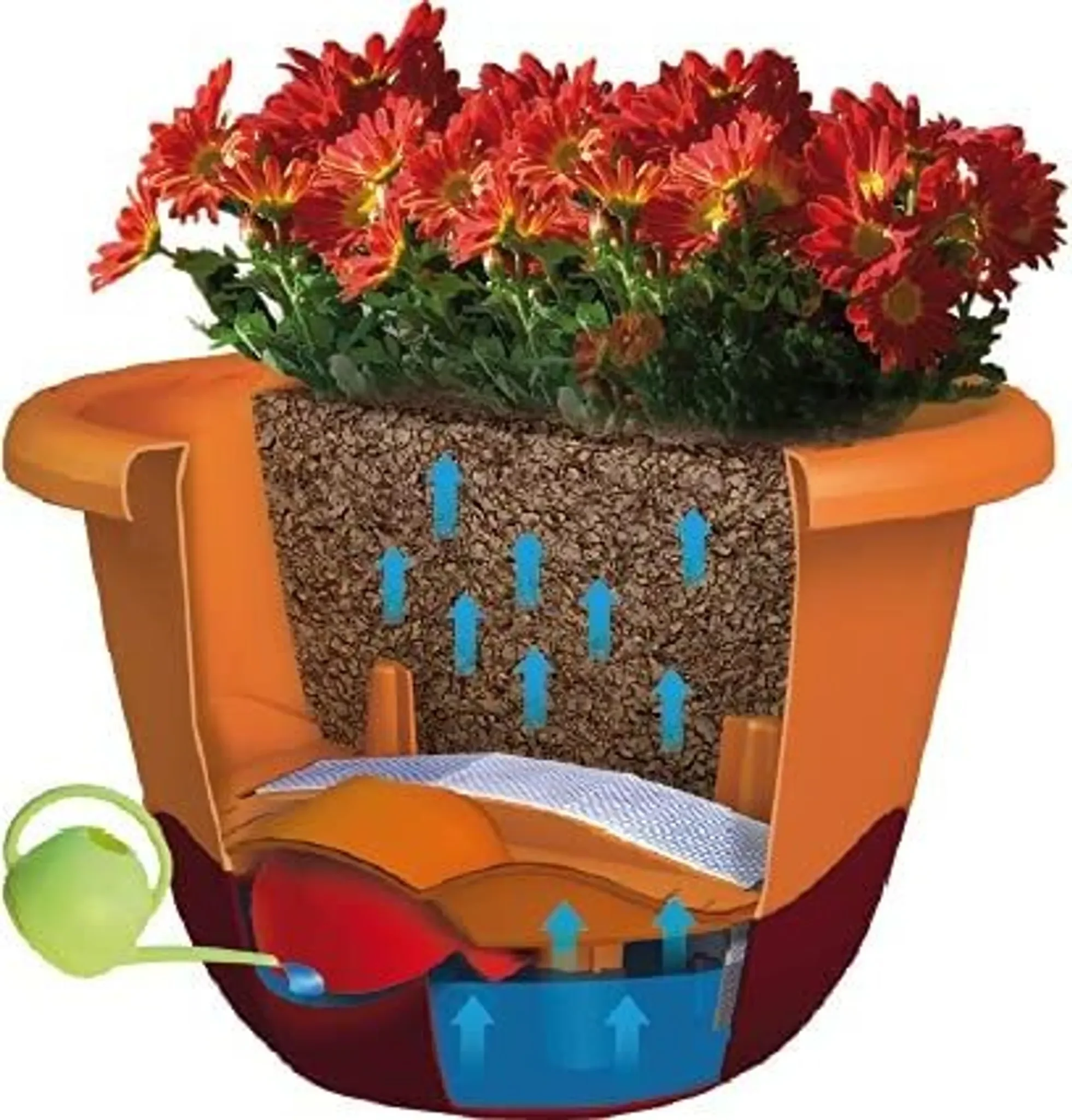 Das System besteht aus zwei ineinanderliegenden Behältern. Der Zwischenraum sorgt für optimale Luftzirkulation im Wurzelbereich und verhindert Staunässe. Ein flaches Bewässerungsband (Docht) transportiert das Wasser kontinuierlich in die Erde – für ein natürliches, gleichmäßiges Wachstum Ihrer Pflanzen.