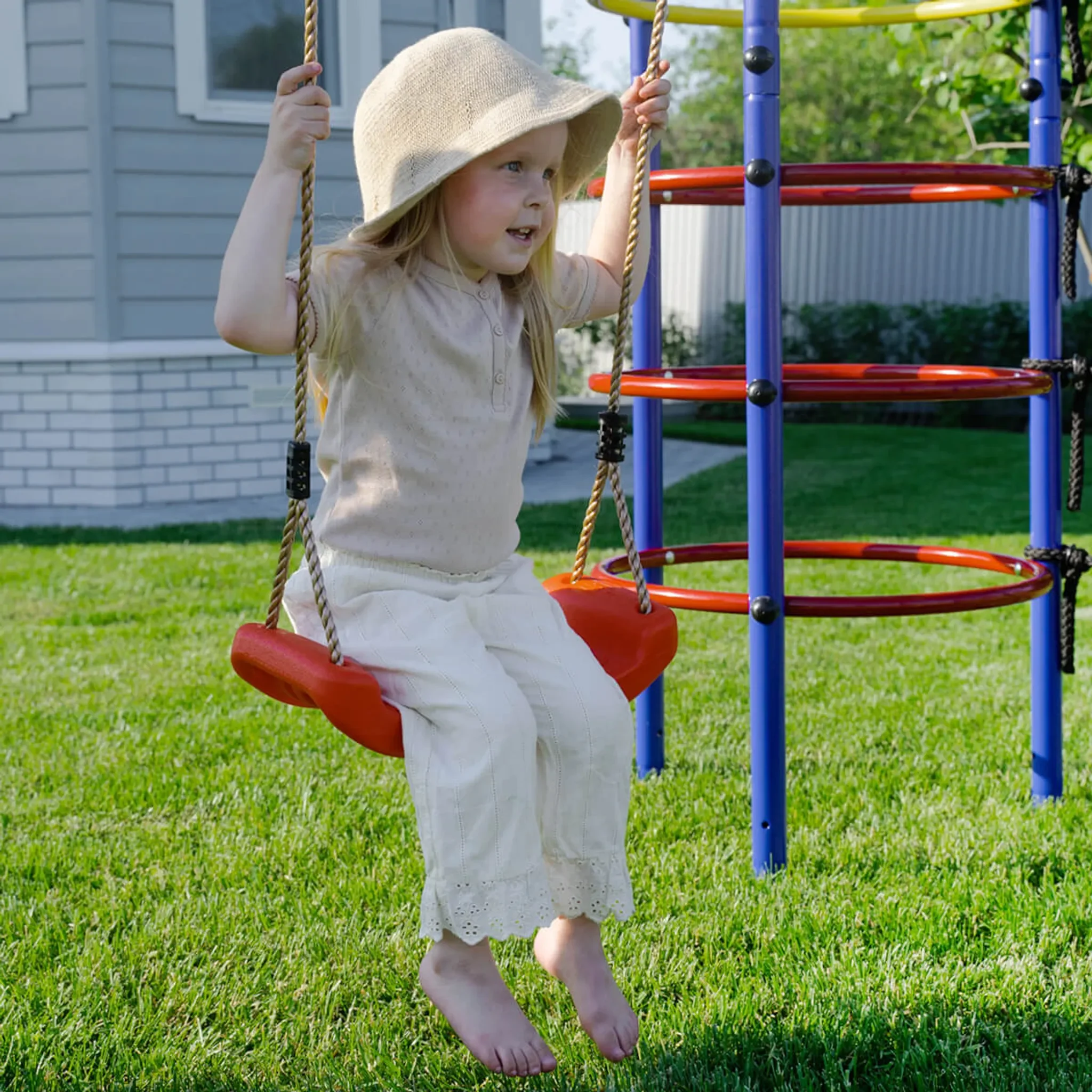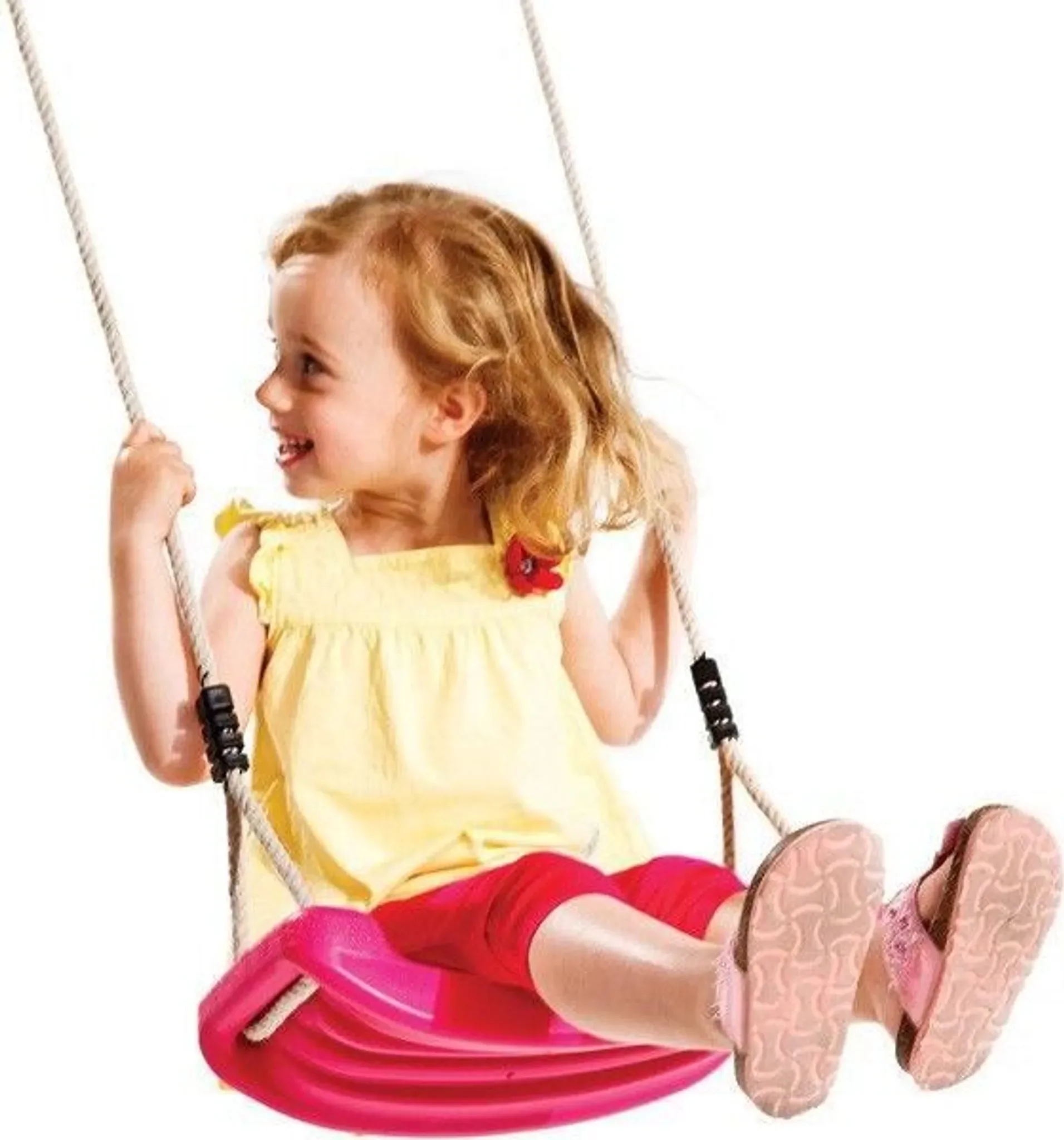 Die gebogenen Seiten mit 17 cm Tiefe sorgen für zusätzlichen Komfort und erhöhen die Sicherheit – besonders für jüngere Kinder. Die höhenverstellbaren Seile ermöglichen eine einfache Anpassung an die Körpergröße und die Höhe des Schaukelgestells.