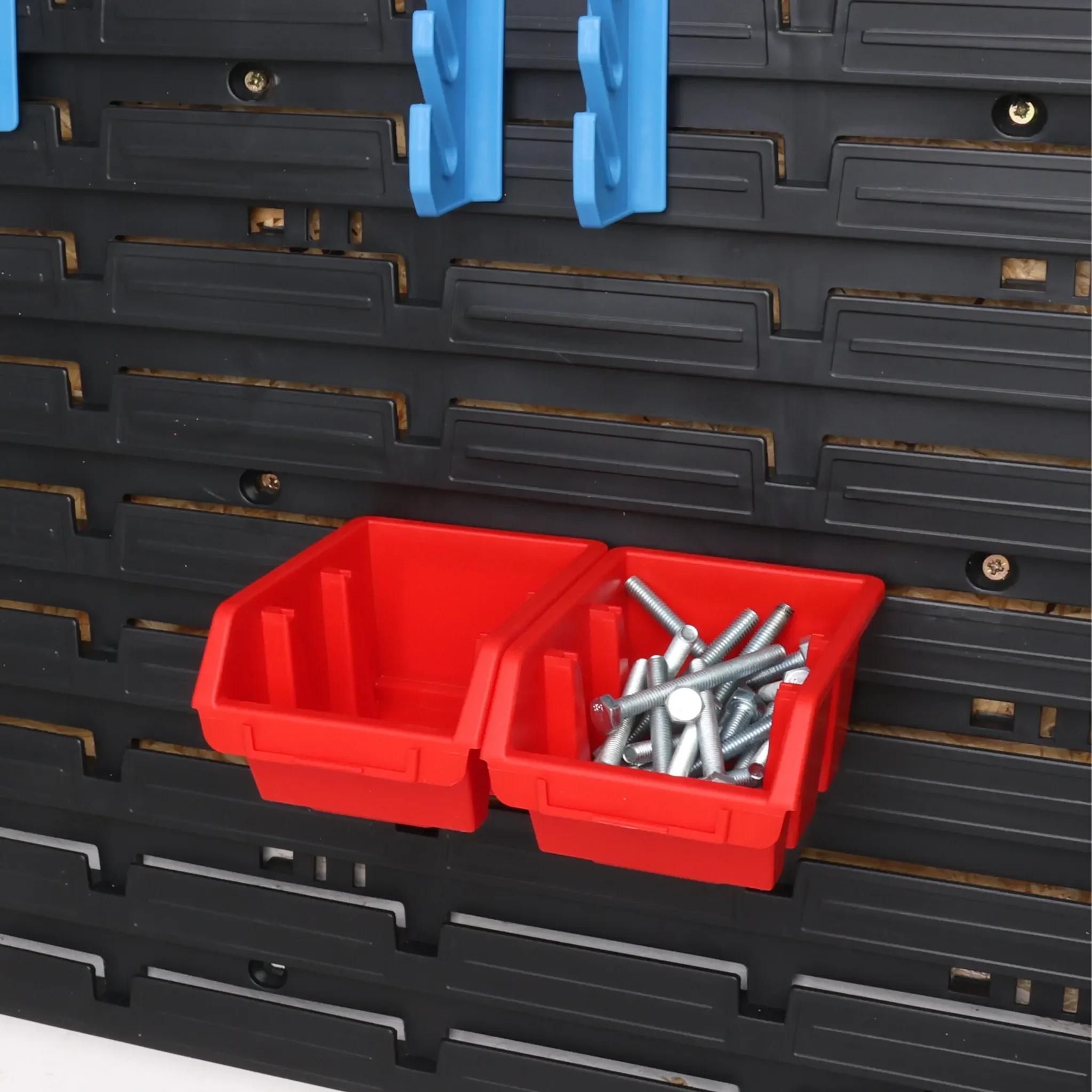 Dank integrierter Haken an der Rückseite lassen sich die Boxen bequem an Regalen oder Lochwänden aufhängen. Alternativ können sie sicher übereinander gestapelt werden. Ein vorgesehenes Etikettenfeld erleichtert die Kennzeichnung des Inhalts und sorgt für schnelle Orientierung im Arbeitsalltag.