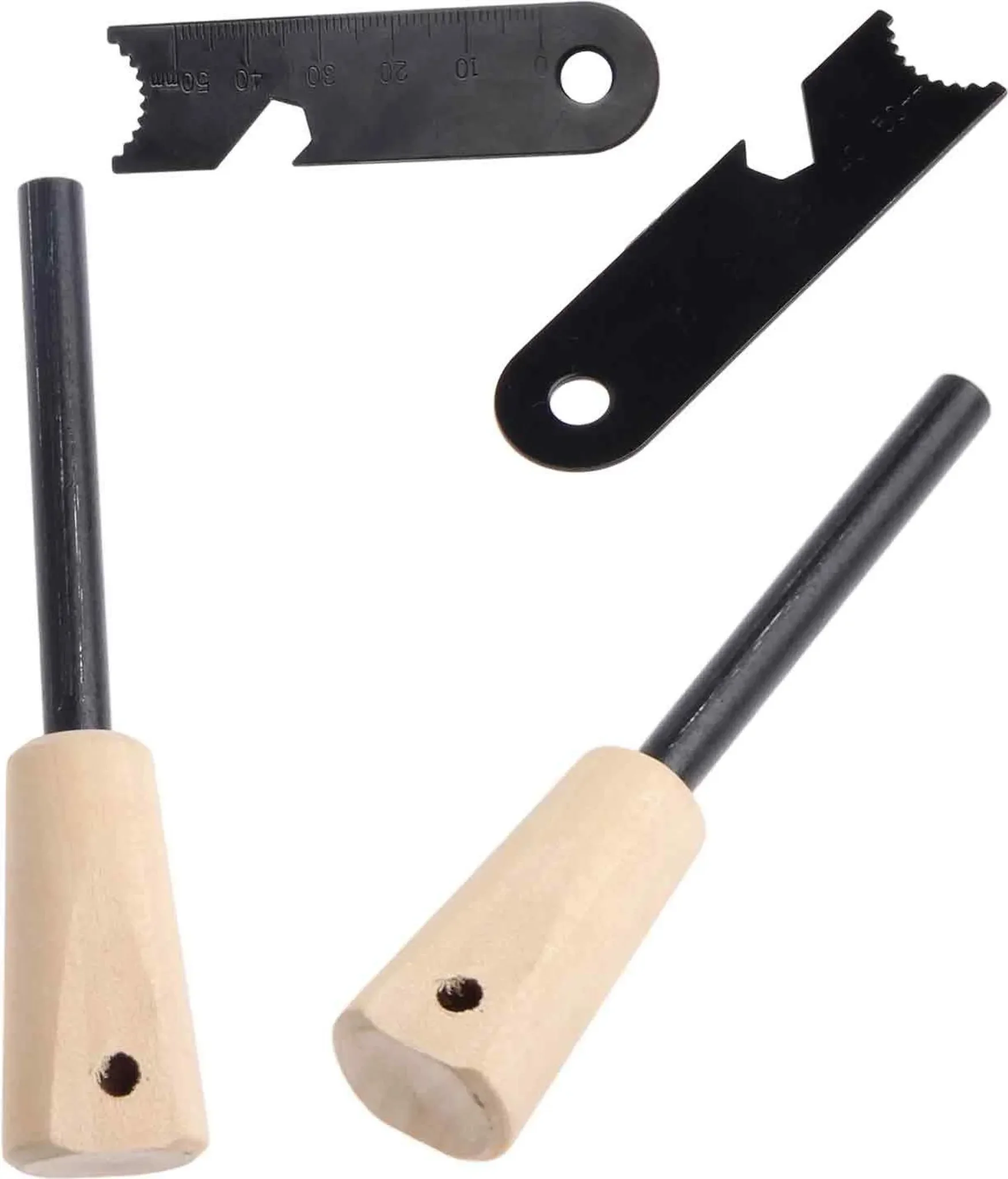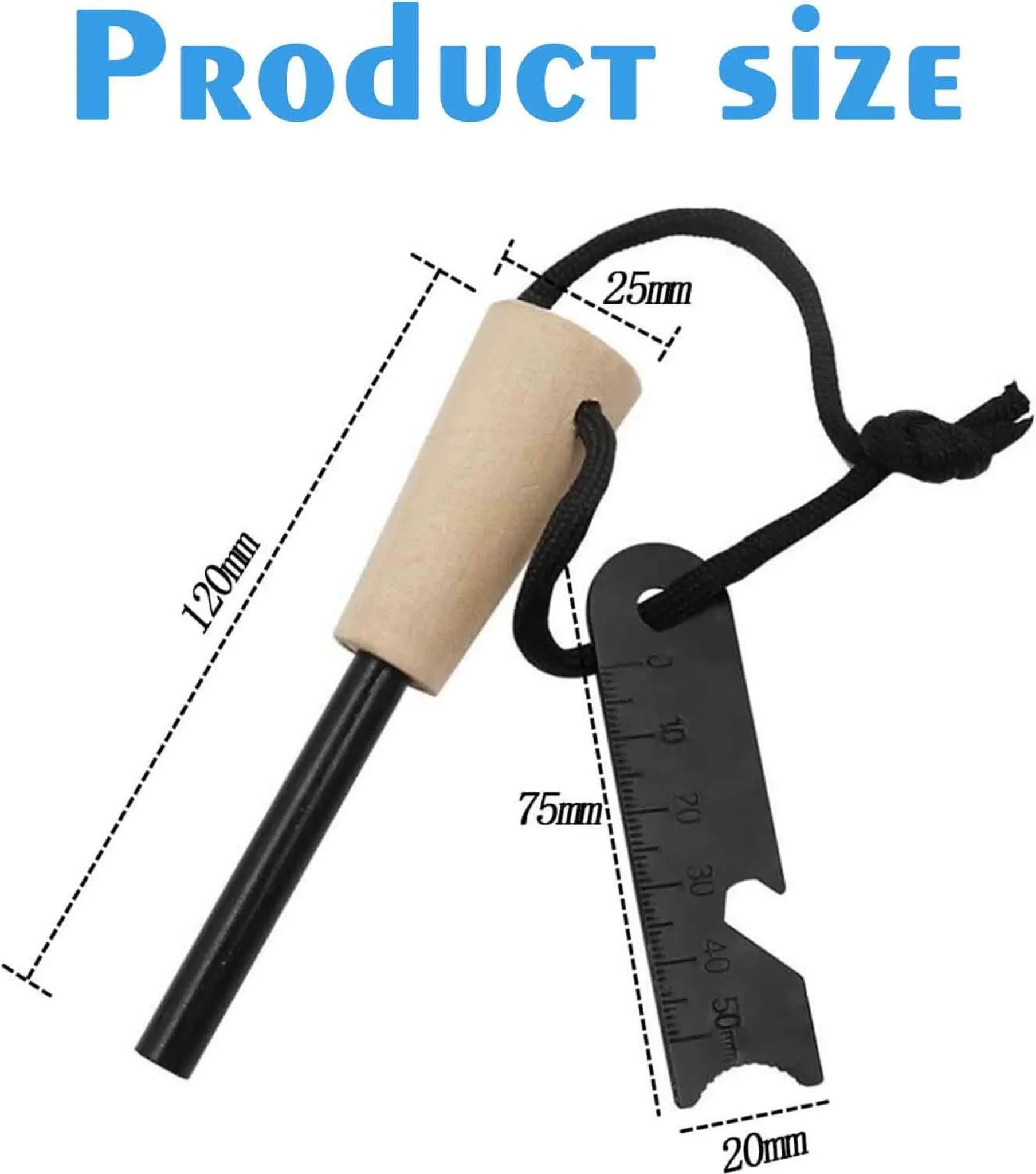 | Enthalten | Feuerstahl mit Holzgriff, Multifunktions-Schaber, Überlebenspfeife, Blasrohre, Befestigungskordel |