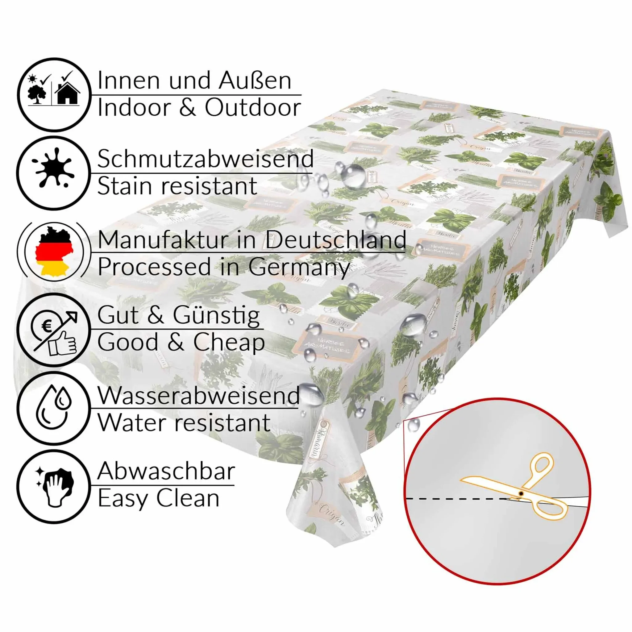 Gefertigt aus hochwertigem Vliesstoff mit PVC-Beschichtung, ist die Tischdecke besonders wasserabweisend, schmutzresistent, robust und rutschfest. Dank der glatten Oberfläche lässt sie sich mühelos mit einem feuchten Tuch reinigen.