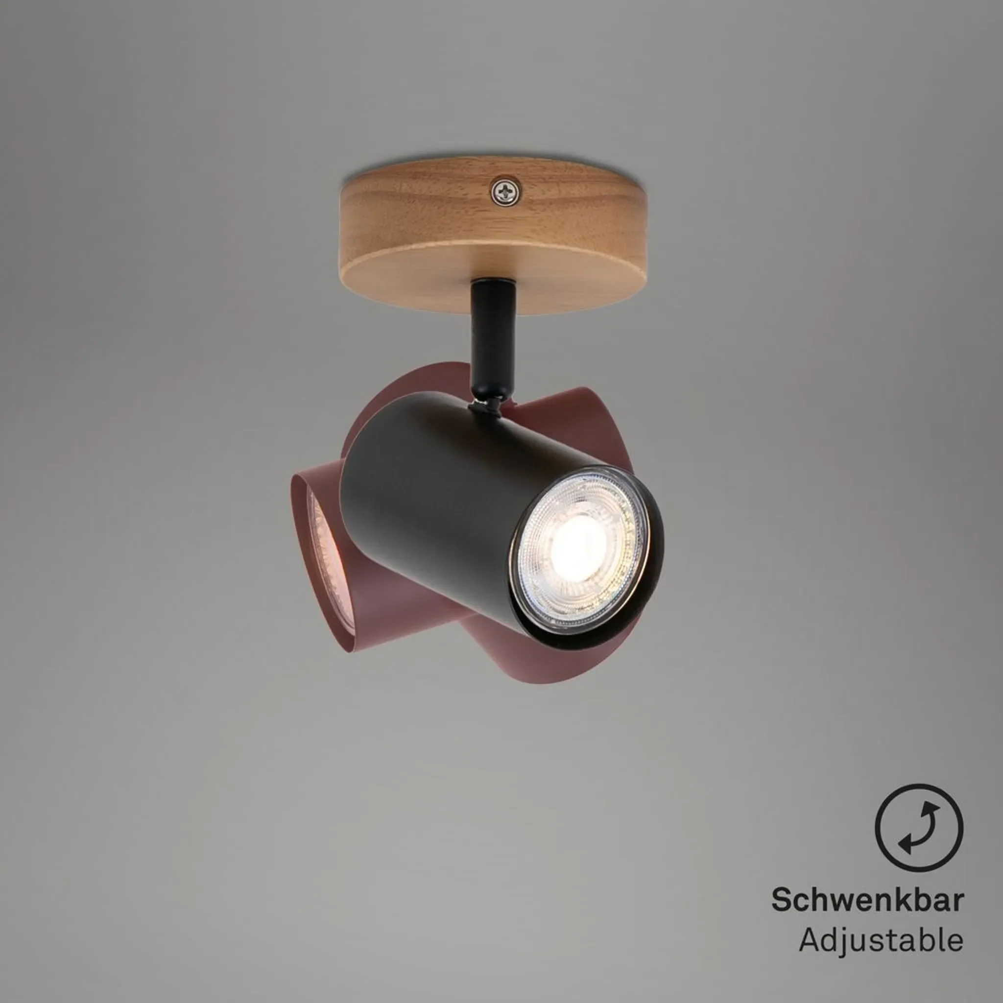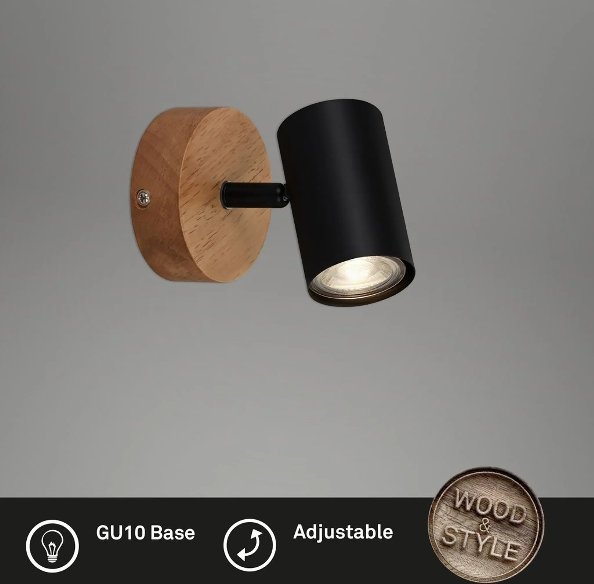 Highlights: Dreh- und schwenkbarer Spotkopf, dekorative Kombination aus Metall und Holz, flexible Wahl des GU10-Leuchtmittels, kompakte Bauform, ideal für gezielte Akzentbeleuchtung.