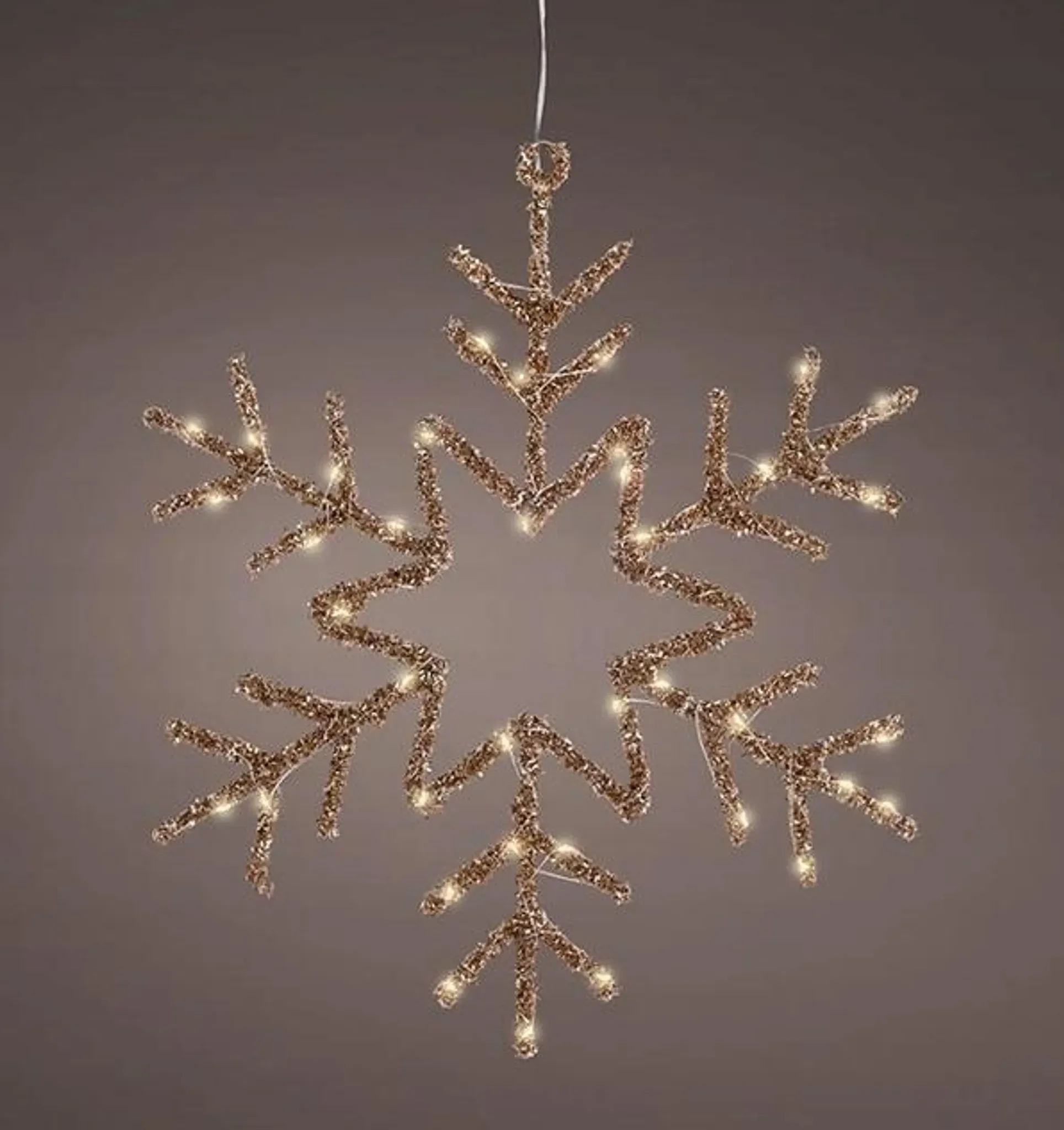Diese stilvolle LED-Hängelampe in Schneeflockenform setzt festliche Akzente in der Weihnachtszeit. Der goldene Rahmen in Kombination mit warmweißem Licht erzeugt eine elegante, gemütliche Atmosphäre und macht die Dekoration zu einem echten Blickfang.